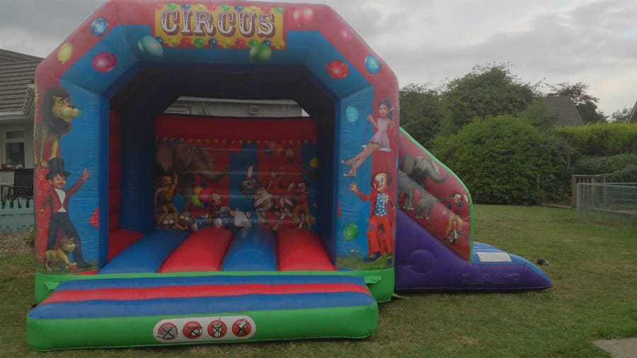 Circus themed Castle with side-slide. Perfect Castle to appeal to all ages with a neutral design for both boys and girl. This unit is fully covered and is essentially an inflatable room.